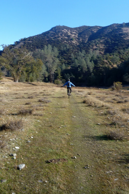 At the bottom, we came to Pacheco Creek Trail; towards Pacheco Camp, this trail is mostly a good double-track but out here it was a rarely used horse trail. We bumped our way over it until the double-track appeared then took off with haste to Pacheco Camp. At Pacheco Camp, Dirk was stretched out on a picnic table making the most of the extra rest time a sprint to the finish affords.